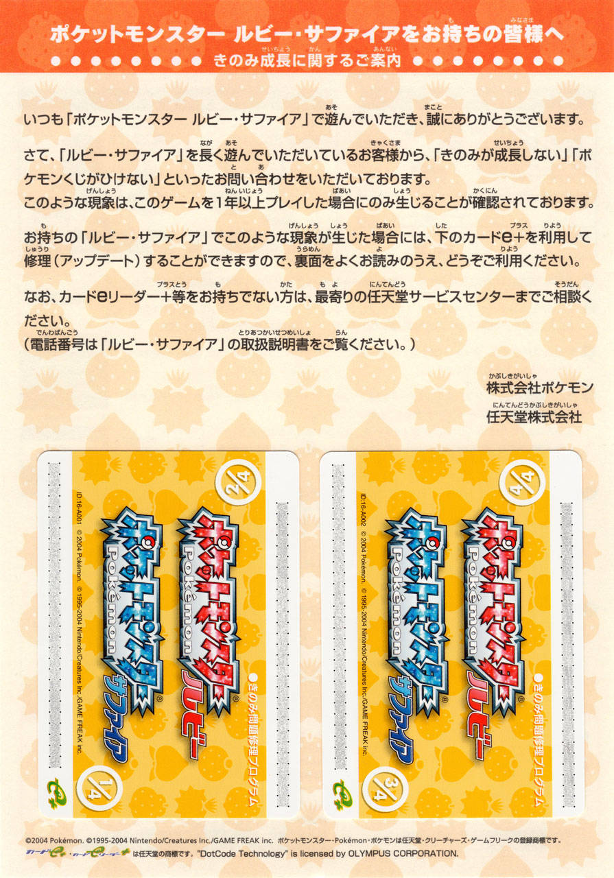 - 欧版和澳版《红宝石/蓝宝石》从 宝可梦频道~与皮卡丘一起!~ 下载基拉祈会自动下载修复程序。